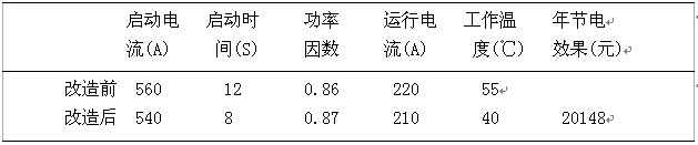 从改造前后技术数据对照表可看出:改造后电动机的启动电流减小了,启动性能改变了,且运行电流下降,功率因数提高了。在环境温度为30℃的情况下,启动器的运行温度小于40℃,启动性能良好,是一种理想的启动元件。 3.2无刷无环启动器在球磨机上的应用 在对全厂十几台真空泵成功改造的基础上,我们对四车间2#湿磨进行了改造。2#湿磨是一台球磨机,配用电机JR128-8 155kW绕线式异步电动机,采用频敏变阻器启动。由于球磨机停车时,钢球堆积在磨子底部,且磨子底部残留许多积料,启动相当困难,有时不得不在原频敏电阻的基础上串联一段金属电阻来改变电动机的启动特性。采用无刷无环启动器后,电动机的启动性能大大改善,启动转矩大大提高,启动电流降低,启动时间短,完全满足了电动机的启动要求,解决了长期困扰我们的难题,减少了大量的检修时间,为其它球磨机的改造奠定了基础。由于球磨机进料量的变化及生产工艺条件的改变,电动机会过载使电流升高,以至过流动作使电动机停止运行。由于负载电流大,电动机的滑环碳刷就会发热,刺火,甚至烧红碳刷,灼伤滑环,以至烧毁电动机转子线圈。采用无刷无环启动器后,当电动机由于过载而减速运行时,转子回路的感应频率随转速下降而升高,启动器的阻抗值相应增大,从而既增大了电动机的拖动力矩,还可使电动机的电流减小,避免了球磨机因过流而跳闸。实际运行中,当负载发生变化时,电动机电流发生波动后,电动机的转速能迅速恢复正常,电动机的转速基本保持不变,所以说无刷无环启动器具有稳速功能。 3.3无刷无环启动器在高压电机上的应用 煤粉磨电机是磨制煤粉的高压电机,电机为JR157-8 320kW绕线式异步电动机,额定电压为6KV,转子电压为501V,转子电流为391A,采用频敏变阻器启动。煤粉车间防火等级要求较高,绕线式异步电动机的启动装置较为复杂,且存在安全隐患。煤粉磨属于球磨机,具有球磨机的所有特性,由于磨制干煤粉,负荷相对湿磨较低,因此我们在对湿磨电机成功改造经验的基础上,对煤粉磨电机进行了无刷无环改造,改造后非常成功,效果明显,改造前后对比见表2所示。